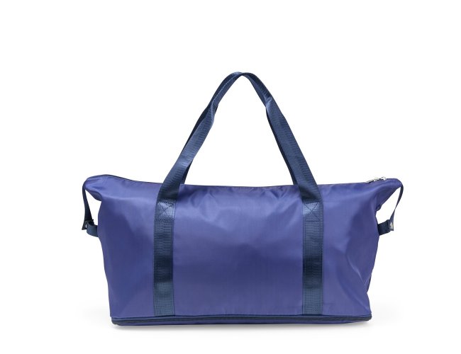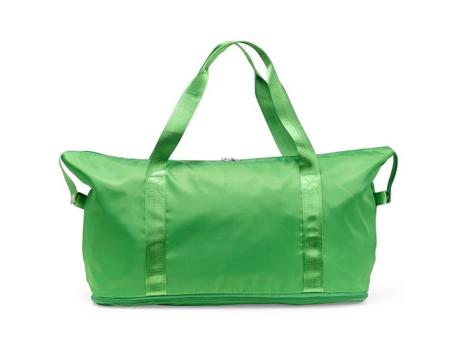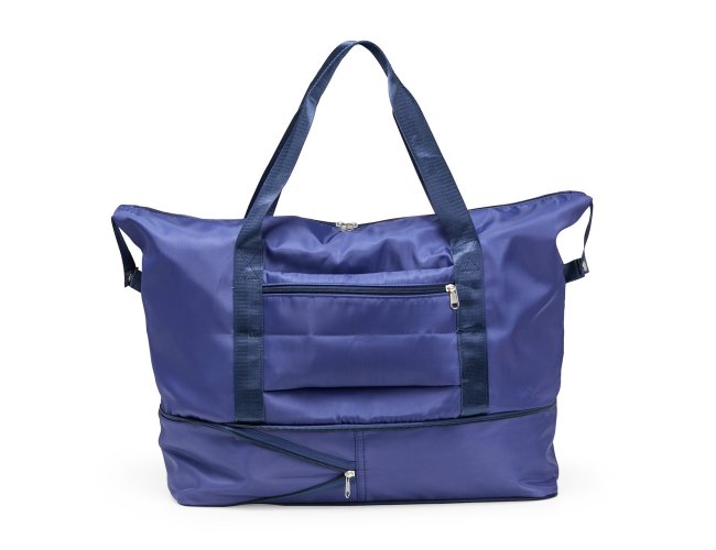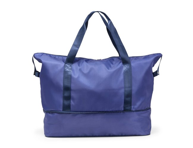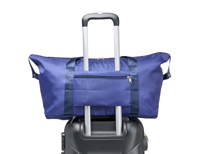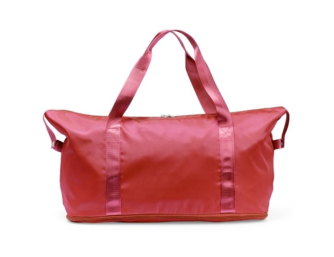 Bolsa esportiva em poliéster resistente à água com alças em nylon e capacidade máxima de 33 litros, obtida a partir da abertura do compartimento inferior. Possui dois bolsos internos, um fechado em zíper e outro aberto, dividido em duas partes iguais. Apresenta um bolso externo com área para encaixe em malas de viagem.