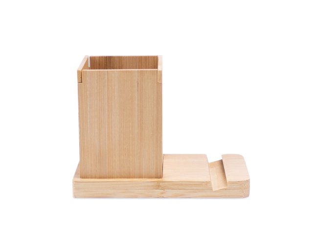 ERWIN. Conjunto de secretária com suporte para celular e copo, em bambu