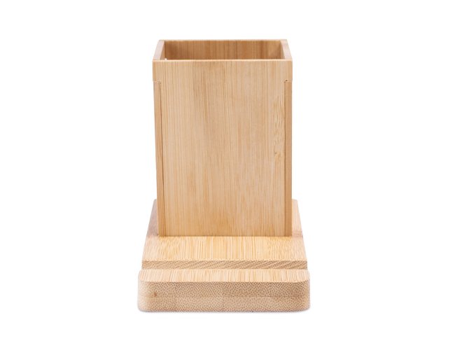 Conjunto de mesa em bambu, ideal para organizar o seu espaço de trabalho. Composto por 1 canaleta para suporte do seu celular e um copo, desmontável, para organizar as suas canetas esferográficas e outros materiais de trabalho. Fornecido em caixa presente de papel kraft reciclado. A cor e o resultado da impressão nos materiais naturais pode variar entre produtos. Dimensões montado: 80 x 145 x 104 mm | Caixa: 80 x 145 x 33 mm