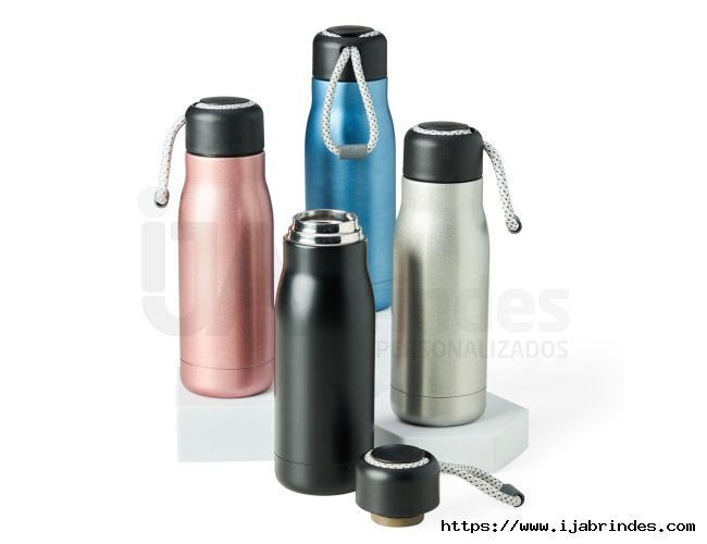 Garrafa inox 304 com parede dupla, capacidade de 270ml. Contém tampa plástica com design de bambu e alça de silicone para transporte.