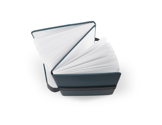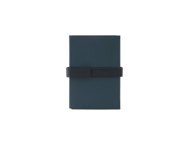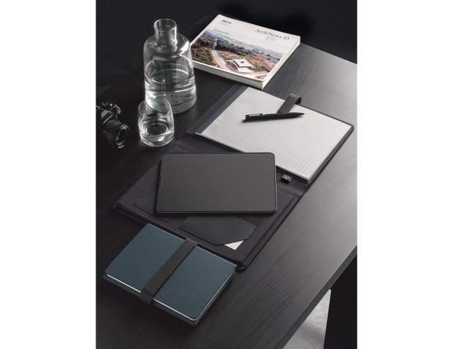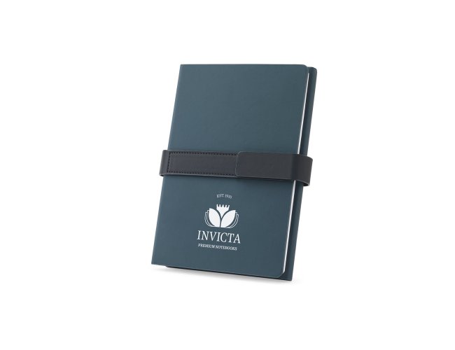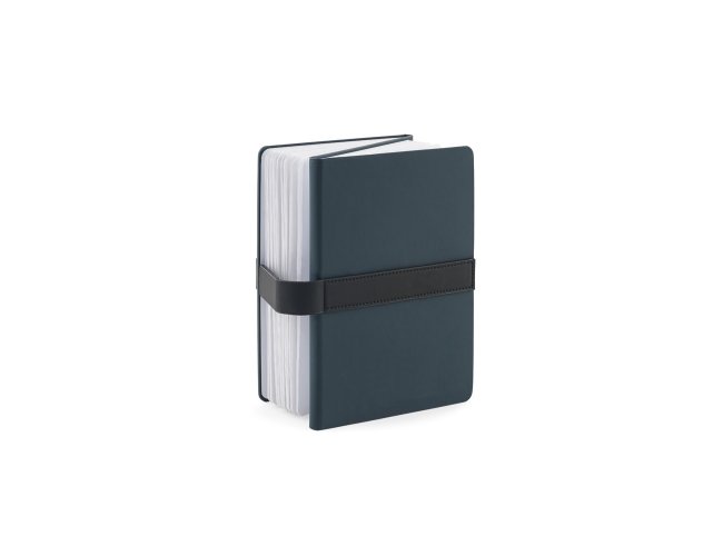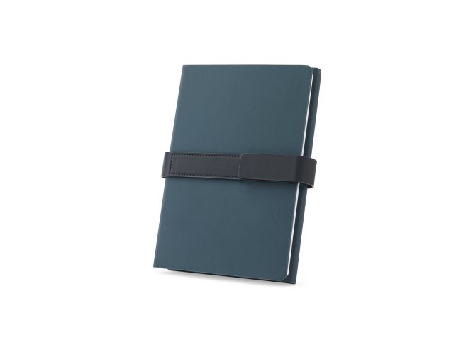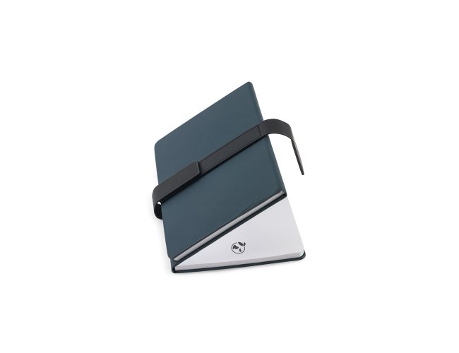 Caderno A5 com um design moderno desenvolvido para ser versátil no seu dia de trabalho. Composto por uma capa dura em 80% materiais reciclados (PU reciclado e poliéster reciclado), este caderno está estruturado em duas partes: a primeira tem 128 páginas pautadas e a segunda 128 páginas lisas, ambas feitas de um material proveniente de gestão florestal sustentável. Contém uma fita para fecho magnético do caderno. 150 x 210 mm