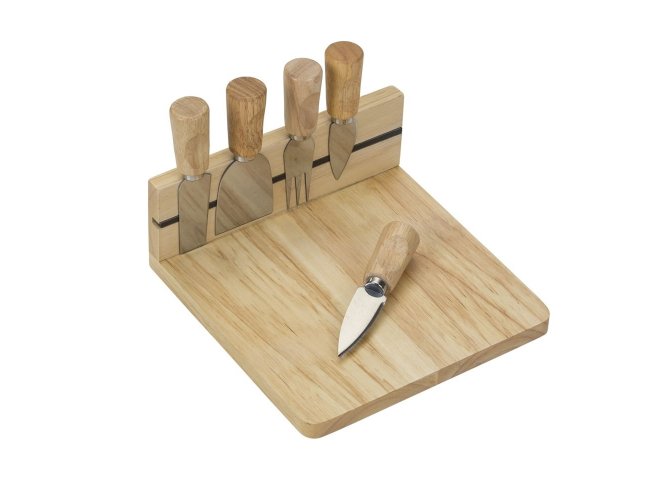 Kit queijo 5 peças em estojo de nylon com zíper e alça. Contém: espátula grande, garfo, faca reta, espátula pequena e tábua de bambu. Estojo com rede interna para guardar a tábua e velcro para ficar as peças.