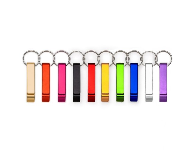 Descrição: Este chaveiro de metal no formato retangular possui a prática função de abridor de garrafa, unindo versatilid