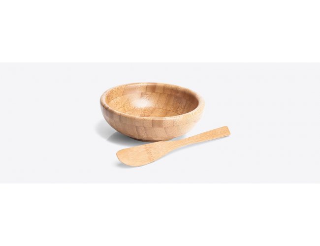Conjunto para Petiscos em Bambu; Acompanha tábua e espátula em Bambu e ramekin.