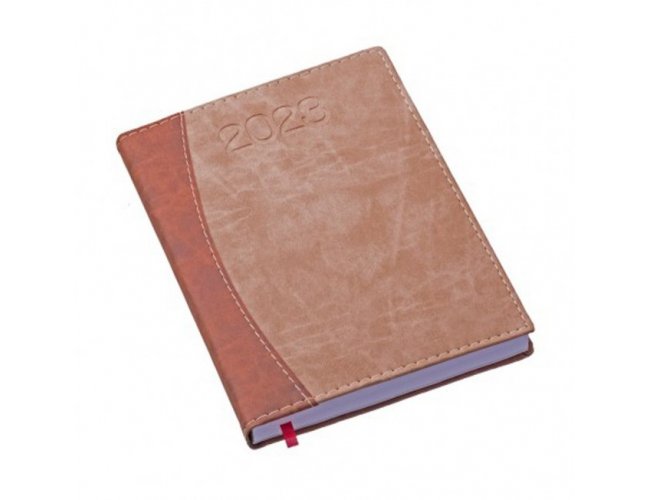 Agenda produzida em couro sintético, possui detalhes de costura e escrita do ano “2023” na parte superior direita. Conté